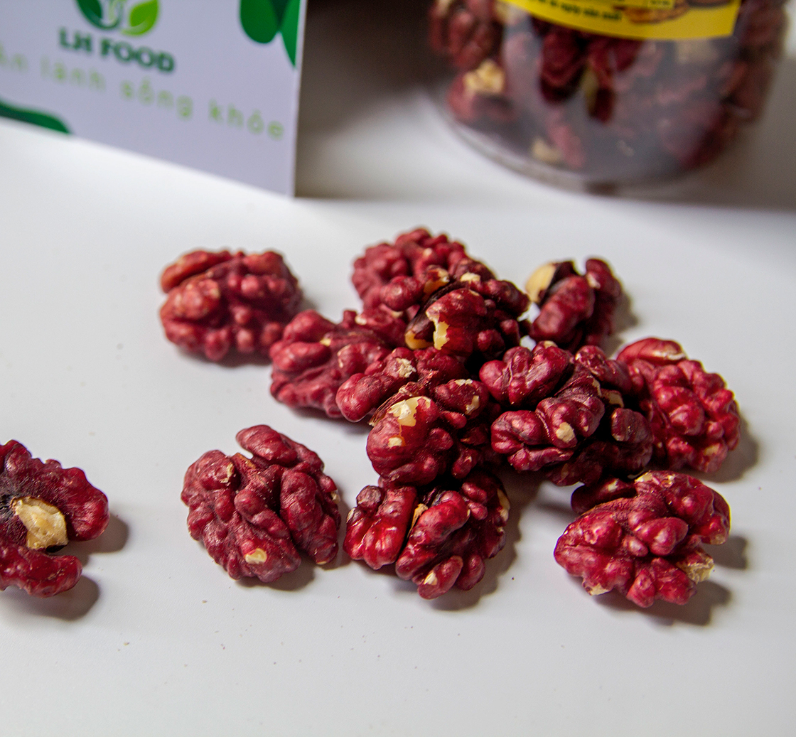 Đặc điểm nổi bật: Hạt óc chó đỏ là loại hạt óc chó không biến đổi Gen được tạo ra bằng phương pháp lai tạo tự nhiên. Sở dĩ được gọi là hạt óc chó đỏ bởi vì sau khi tách lớp vỏ cứng bên ngoài thì nhân bên trong có một lớp vỏ lụa màu đỏ, thịt bên trong nhân là màu trắng sữa. Óc chó đỏ có vị giòn thơm, bùi béo nhẹ hơn óc chó Vàng